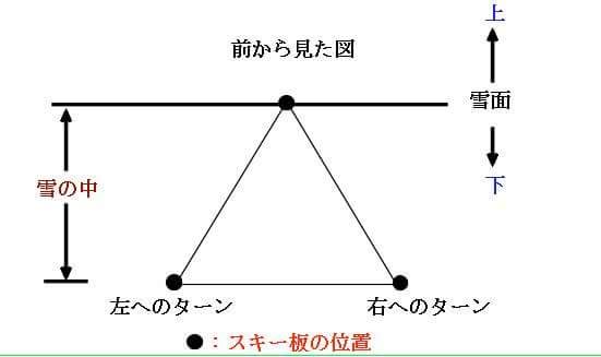 では何故、スキー板のトップが見えて雪面に浮いた時に左右の方向転換を行わなければならないのかと言うと、スキー板が雪の中で上下する動きを左右の動きに変換させる都合があるからです。