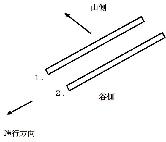 図の状態でまず最初に、1.の板がハンドルの役目(方向転換)でブレーキ操作を伴いながら山側へ動き始めると同時に、2.の板の外側のエッジで雪面をひっかきながら前に押し出す感覚で、1.のスキー板を追い掛ければ良いのです。